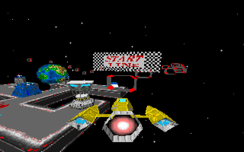 Race against up to ten computer controlled opponents surrounding a space port or around planets.